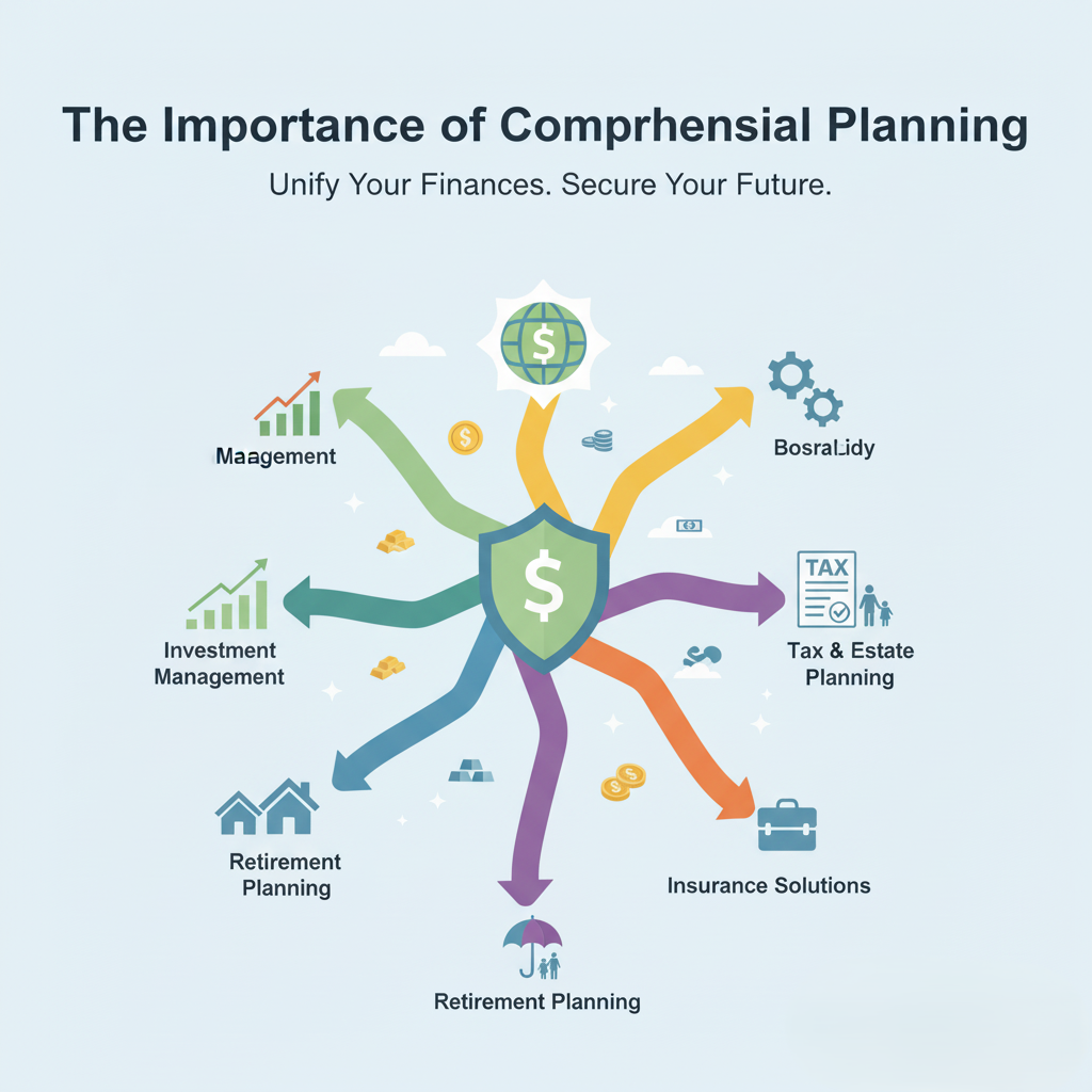 Integrated approach covering investments, retirement, tax, estate, insurance.
